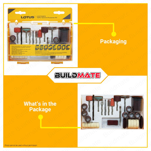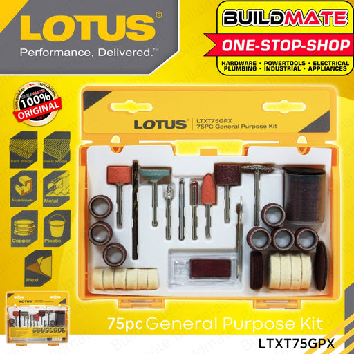 Buildmate Online DepotLOTUS General Purpose Kit 75 PCS/SET Cutting Grinding Carving Polishing Sanding Cleaning LTXT75GPX •BUILDMATE• SPECIFICATIONS: ►75 PCS/SET ►For Cut...