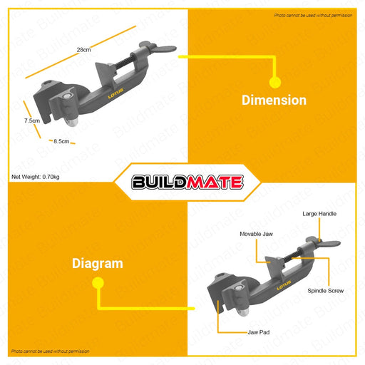 Buildmate Online DepotLOTUS Quick Release G Clamp 4" LTHT100GCX •BUILDMATE• LHT FEATURES: ►Suitable for both metal and wood working ►Rugged die cast aluminum alloy body...