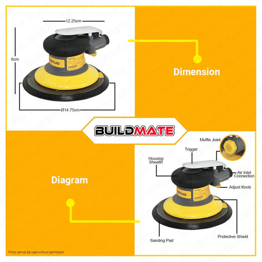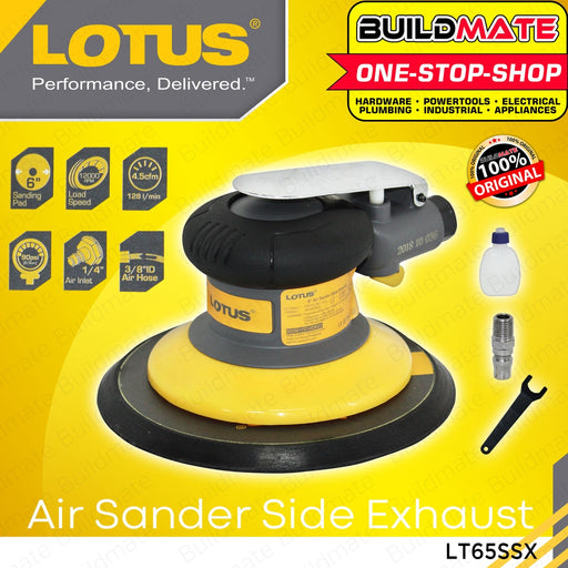 Buildmate Online DepotLOTUS Pneumatic Air Sander With Side Exhaust 6" LT65SSX •BUILDMATE• LPT SPECIFICATIONS: ►Sanding Pad: 6” (150mm) ►No Load Speed: 12,000rpm ►Air C...