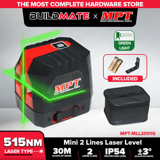 Buildmate Online DepotNo reviewsMPT Mini 2 Lines Line Laser Level MLL2001G PT • MOST PROFESSIONAL TOOLS • SPECIFICATIONS: ► Model: MLL2001G► Laser: Green► Laser Type: 515nm► Scope...