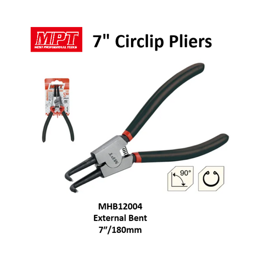 Buildmate Online DepotNo reviewsMPT 7" External Bent Circlip Pliers MHB12004 HT •MOST PROFESSIONAL TOOLS • SPECIFICATIONS:-Size: (7″/180mm)-45# steel forged-Shiny polished and ...