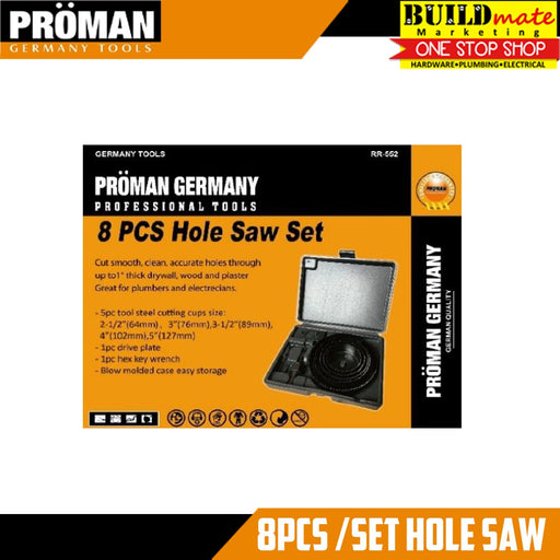 Buildmate Online DepotPROMAN Hole Saw 8PCS/SET RR-552 •BUILDMATE•SPECIFICATIONS:►5pcs tool steel cutting cups sizes:►2 1/2"(64mm , 3"(76mm) , 31/2" (89mm) , 4" (102mm) ,...