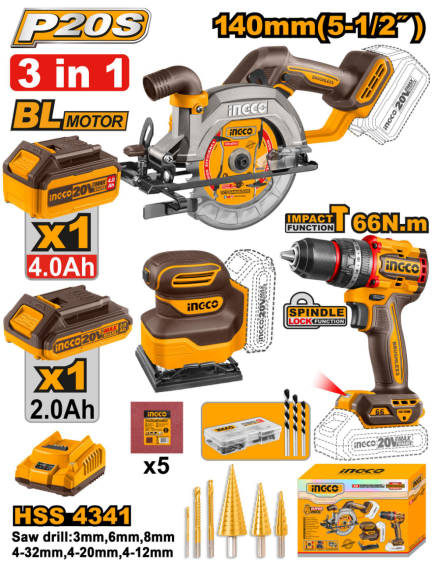 INGCO 20V 3pcs Cordless Combo Kit Set | Circular Saw, Impact Drill, Sheet Sander COSLI241193 ICPT - BUILDMATE