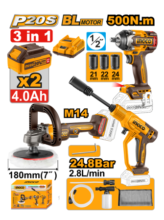 INGCO 20V 3pcs Cordless Combo Kit Set | Polisher, Impact Wrench, & Pressure Washer COSLI250184 ICPT - BUILDMATE