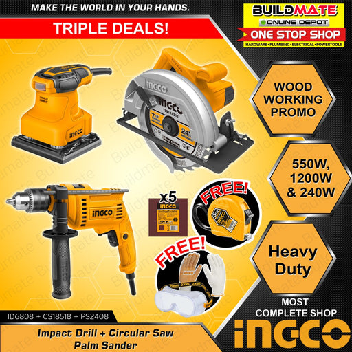 [COMBO E] INGCO Impact Drill ID6808 + Circular Saw CS18518 + Palm Sander PS2408 + FREE GLOVES, GOGGLES & TAPE MEASURE •BUILDMATE• IPT