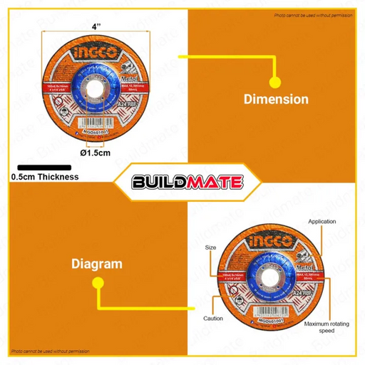 BUILDMATE Ingco Grinding Disc 100x6x16mm Abrasive Cutting Wheel Disc for Metal SOLD PER PIECE MGD601001 - IHT