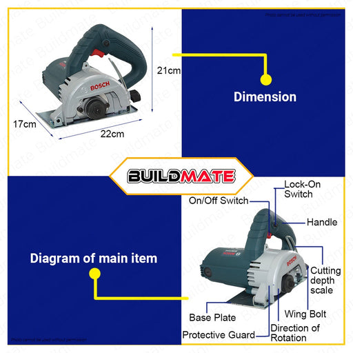 Buildmate Online DepotBosch Professional Marble Cutting Cut Saw 1400W GDC 140 06013A40K0 100% ORIGINAL / AUTHENTIC •BUILDMATE• COC SPECIFICATIONS: ►Rated input power: 1...