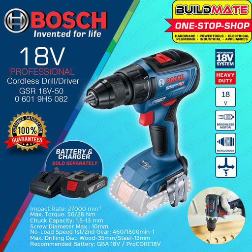 Buildmate Online DepotBOSCH Professional Lithium Ion Li-Ion Cordless Drill Driver GSR 18V-50 06019H5082 100% ORIGINAL / AUTHENTIC •BUILDMATE• SPECIFICATIONS: ►Battery v...