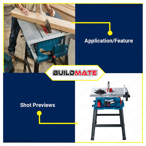 Buildmate Online DepotBOSCH Professional Table Saw COC GTS 254 0601B450K0 100% ORIGINAL / AUTHENTIC •BUILDMATE• SPECIFICATIONS: ►Saw blade diameter: 254 mm ►Incline se...