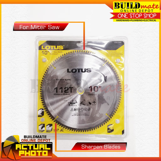 Buildmate Online DepotLOTUS 10" TCT Saw Blade For Aluminum 112T LT10-112ASX •BUILDMATE• SPECIFICATIONS: ►112T ►250mm x 25.4mm ►Max. Speed: 5000RPM ►For Aluminum FEAT...