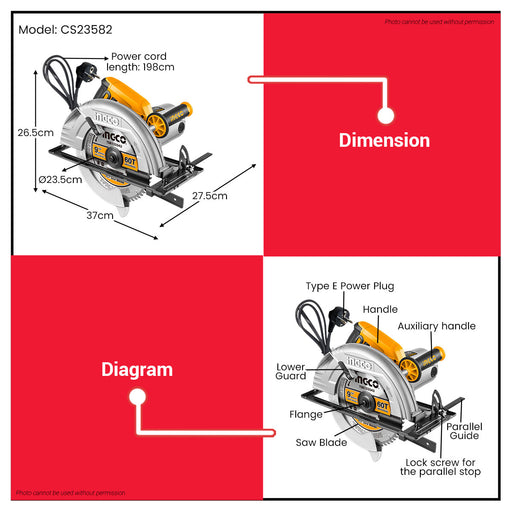 Buildmate Online DepotINGCO Industrial Circular Saw 9" 2200W CS23582 •BUILDMATE• IPTSPECIFICATIONS:► Voltage:220-240V~50/60Hz► Input power:2200W► No-load speed:3800rpm► ...