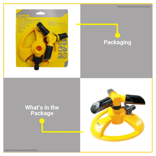 Buildmate Online DepotLOTUS Garden 3 Arm Rotating Sprinkler LTGT3VRX •BUILDMATE• LHT LUTOS FEATURES: ►Made of sturdy plastic ►Rotary 3 Arm sprinkle for circular unifor...