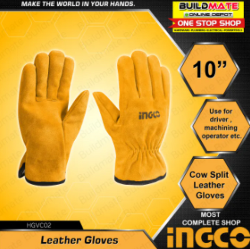 Buildmate Online DepotINGCO Leather Gloves 10" HGVC02 •BUILDMATE•SPECIFICATIONS:►Size: 10"►Use for driver , machining operator etc►Cow split leather gloves►Full palm lining