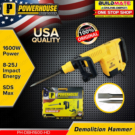 Buildmate Online DepotPOWERHOUSE Demolition Hammer 1600W PH-DBH1600-HD •BUILDMATE• PHPT SPECIFICATIONS: ►Rated Voltage: 220V ►Impact Rate: 500-400 BMP ►Impact Energy: ...