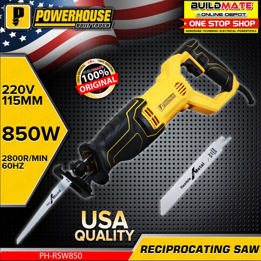 Buildmate Online DepotPOWERHOUSE Reciprocating Saw Max Cutting 115mm 850W PH-RSW850 •BUILDMATE• PHPT SPECIFICATIONS: ►Model: RSW850 ►Input Power: 850W ►Rated Speed: 2800...