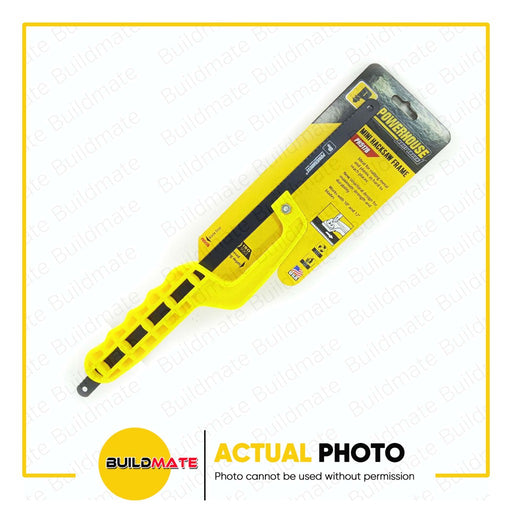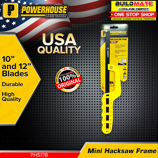 Buildmate Online DepotPOWERHOUSE Mini Hacksaw frame with blade PH517B •BUILDMATE• PHHTSPECIFICATIONS:►10" & 12" BladesFEATURES:►Ergonomic grip with thumb rest for ma...