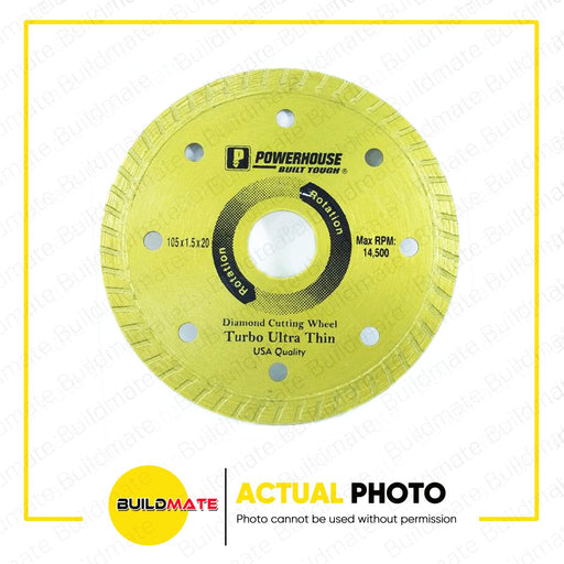 Buildmate Online DepotPOWERHOUSE Diamond Cutting Wheel Turbo Ultra Thin Cut 4" UT105 •BUILDMATE• PHPTA SPECIFICATIONS: ► Size: 4" (105mmx1.5mm) ► Type: Ultra Thin Cut ...
