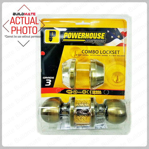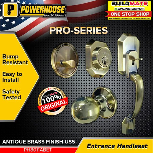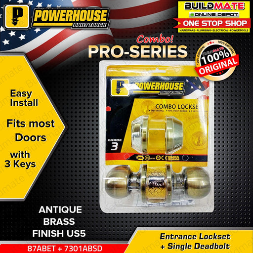 Buildmate Online DepotBUILDMATE Powerhouse PRO SERIES COMBO Entrance Lockset + Single Deadbolt Antique Brass Finish Door Knob 587PBET + 7301PBSD Brass Finish | 100% ORIG...