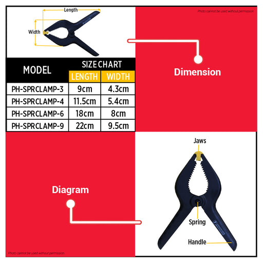 Buildmate Online DepotNo reviewsPowerHouse 3 - 9 Inches Spring Clamp PHHT Available in:- 3" (33mm x 75mm) (PH-SPRCLAMP-3) - 4" (40mm x 100mm) (PH-SPRCLAMP-4)- 6" (70mm x 150mm) (P...
