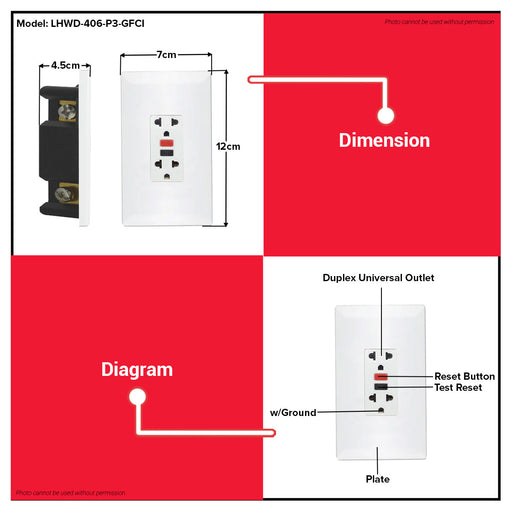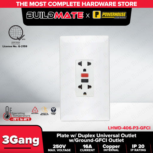 Buildmate Online DepotNo reviewsPowerHouse Electric 3 Gang Plate w/ Duplex Universal Outlet w/ Ground GFCI Outlet 120mm x 70mm (250V/16A) LHWD-406-P3-GFCI PHE SPECIFICATIONS:- Mo...