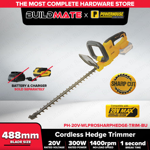 Buildmate Online DepotNo reviewsPowerHouse Bare Unit Cordless Sharp Cut Hedge Trimmer 20V Charger and Battery not included PH-20V-WLPROSHARPHEDGE-TRIM-BU PHPT SPECIFICATIONS:- Po...