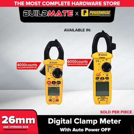 Buildmate Online DepotNo reviewsPowerhouse Digital Clamp Meter 4,000/ 6,000 Counts AC/DC Voltage 600V/CAT II PHHT SPECIFICATIONS:► MODEL: CM2600F-4K► 4,000 counts► With flashlig...