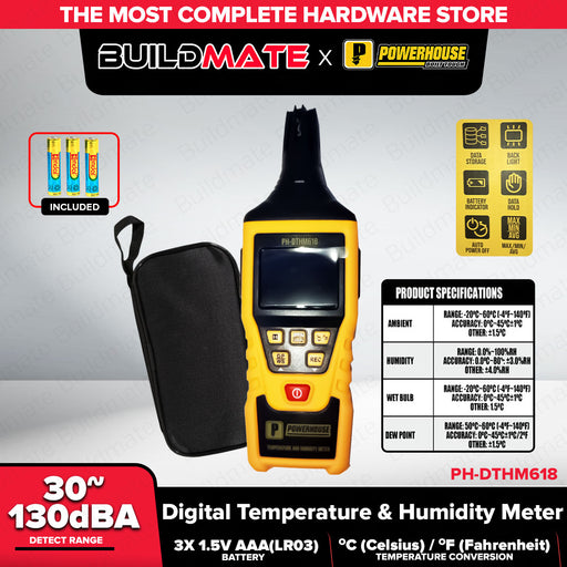 Buildmate Online DepotNo reviewsPowerHouse Digital Temperature Thermometer and Humidity Meter w/Max/Min/Avg Data Hold PH-DTHM618 PHHT SPECIFICATION:► Model: PH-DTHM618 Ambient:►...