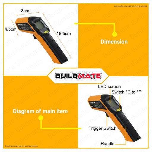 Buildmate Online DepotHoteche Digital Infrared Thermometer HTC-285501 •BUILDMATE• SPECIFICATIONS: ►Model: 285501 ►Max. Range: 520 degree C /968 degree C ►Spectral Respo...