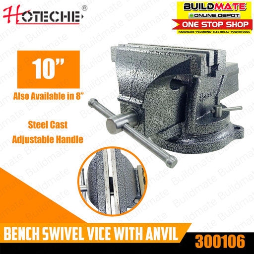 Buildmate Online DepotHOTECHE Bench Vice Swivel Base with Anvil 10" 300106 •BUILDMATE• SPECIFICATIONS: ►10" ►Swivel base with anvil ►Hardened and tempered jaws
