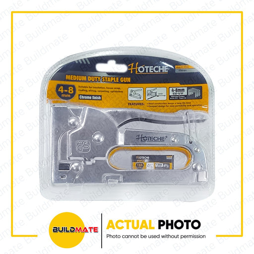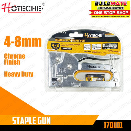 Buildmate Online DepotHOTECHE Staple Gun 8mm Chrome Finish 170101 •BUILDMATE• SPECIFICATIONS: ►8mm ►Chrome Finish ►Adjustable Driving Force