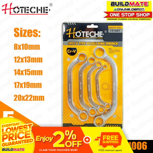 Buildmate Online DepotHOTECHE 5PCS/SET U Type Double Ring Wrench Cr-V 191007 •BUILDMATE• SPECIFICATIONS: ►5PCS/SET ►U Type ►Double Ring ►Cr-V ►Sizes: - 8 x 10mm - 12 x ...