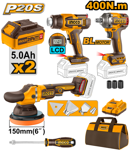 BUILDMATE Ingco 3pcs Cordless Combo Kit Cordless Impact Wrench with Cordless Polisher and Heat Gun COSLI240863 - ICPT