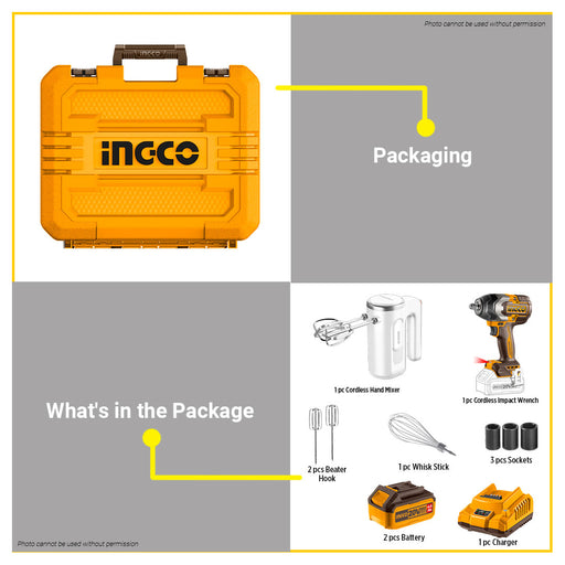 BUILDMATE Ingco 2pcs Cordless Combo Kit Cordless Impact Wrench with Cordless Hand Mixer COSLI240787 - ICPT