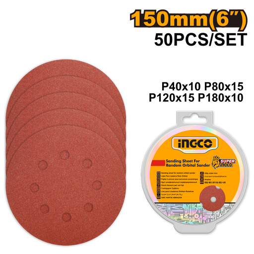 Buildmate Online DepotNo reviewsBUILDMATE Ingco 6" Inch Sanding Sheet for Random Orbital Sander 150MM AKRS1500511 - IHT SPECIFICATION:Model: AKRS1500511Size: 150mm (6")50pcs/setP4...