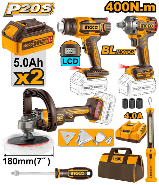 BUILDMATE Ingco 4pcs Cordless Combo Kit Cordless Polisher with Cordless Heat Gun, Cordless Impact Wrench and Cordless Work Lamp Combo Set COSLI241182 - ICPT