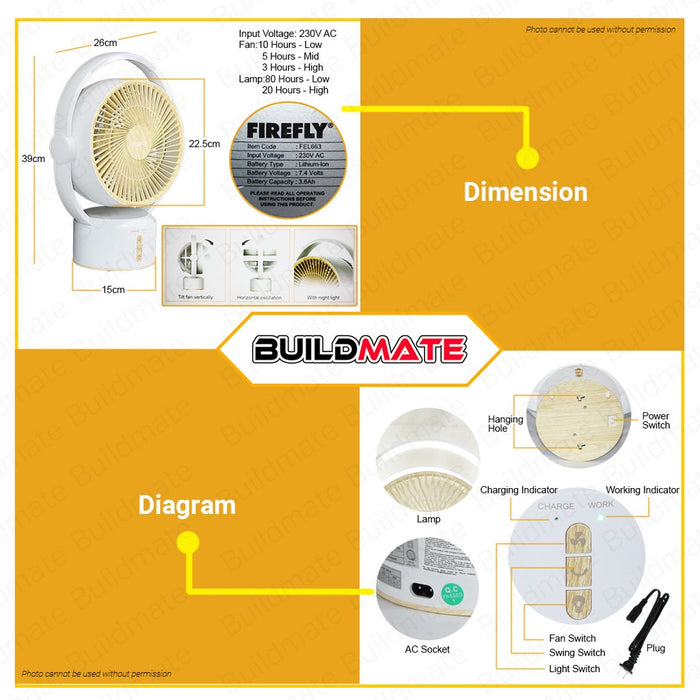 FIREFLY Rechargeable Lithium Ion Li-Ion Circulator Fan 9" inches FEL663 100% ORIGINAL •BUILDMATE•