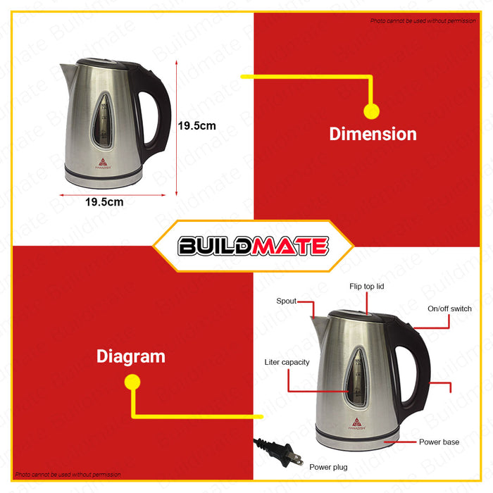 HANABISHI Stainless Steel Cordless Water Kettle 1.2L 1370W HWK-112SS •BUILDMATE•