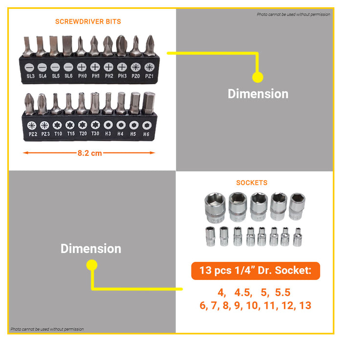 ►13pcs 1/4" Drive Sockets (4mm, 4.5mm, 5mm, 5.5mm, 6mm, 7mm, 8mm, 9mm, 10mm, 11mm, 12mm, 13mm, 14mm)