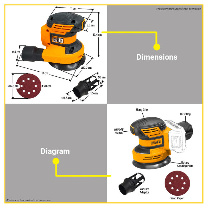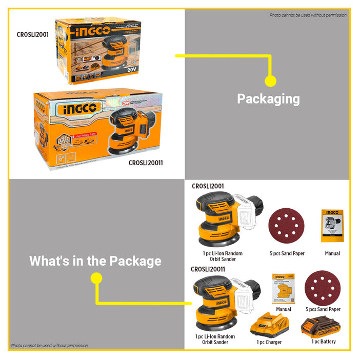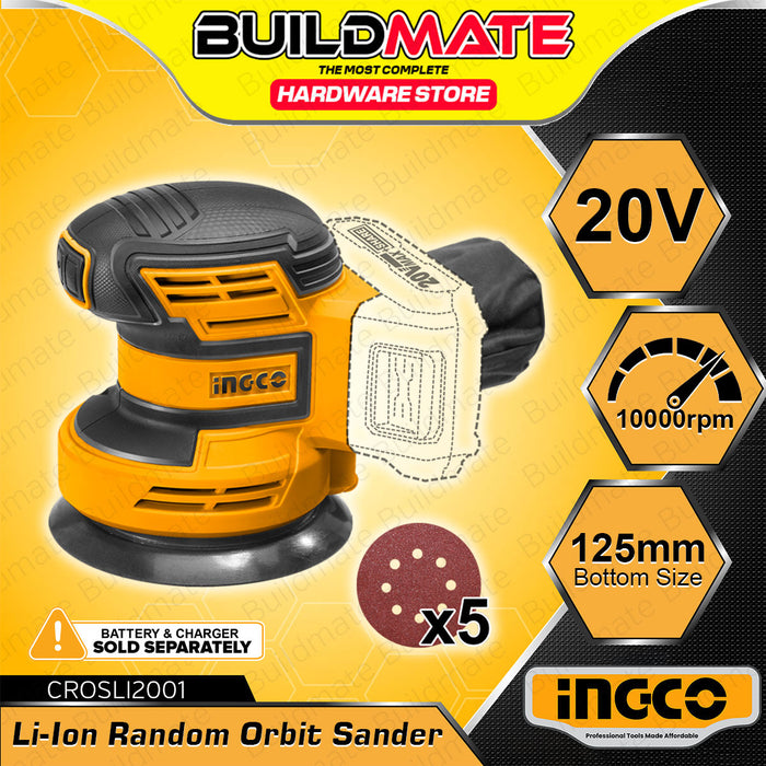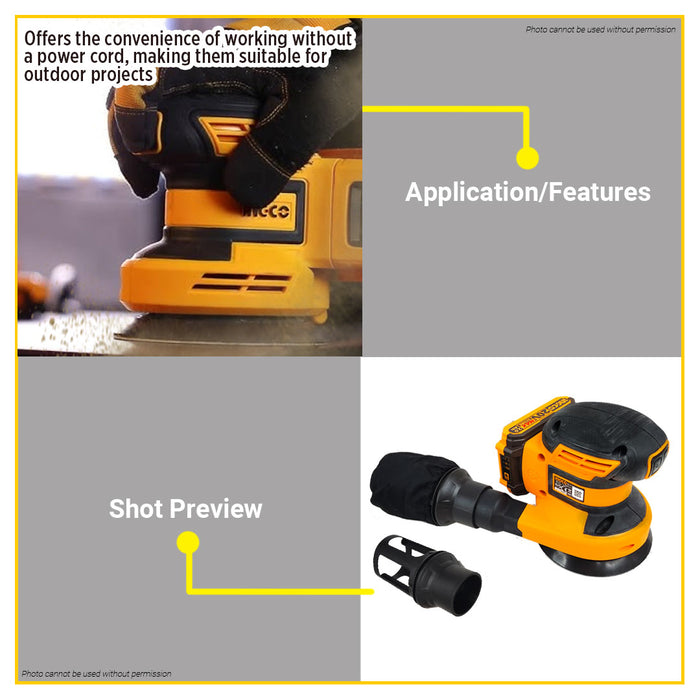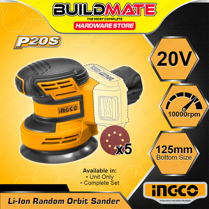 BUILDMATE Ingco 20V Lithium-Ion Random Orbit Sander 125mm with 5pcs Sand Paper Rechargeable Cordless Orbital Sander Woodworking Sanding Machine - ICPT